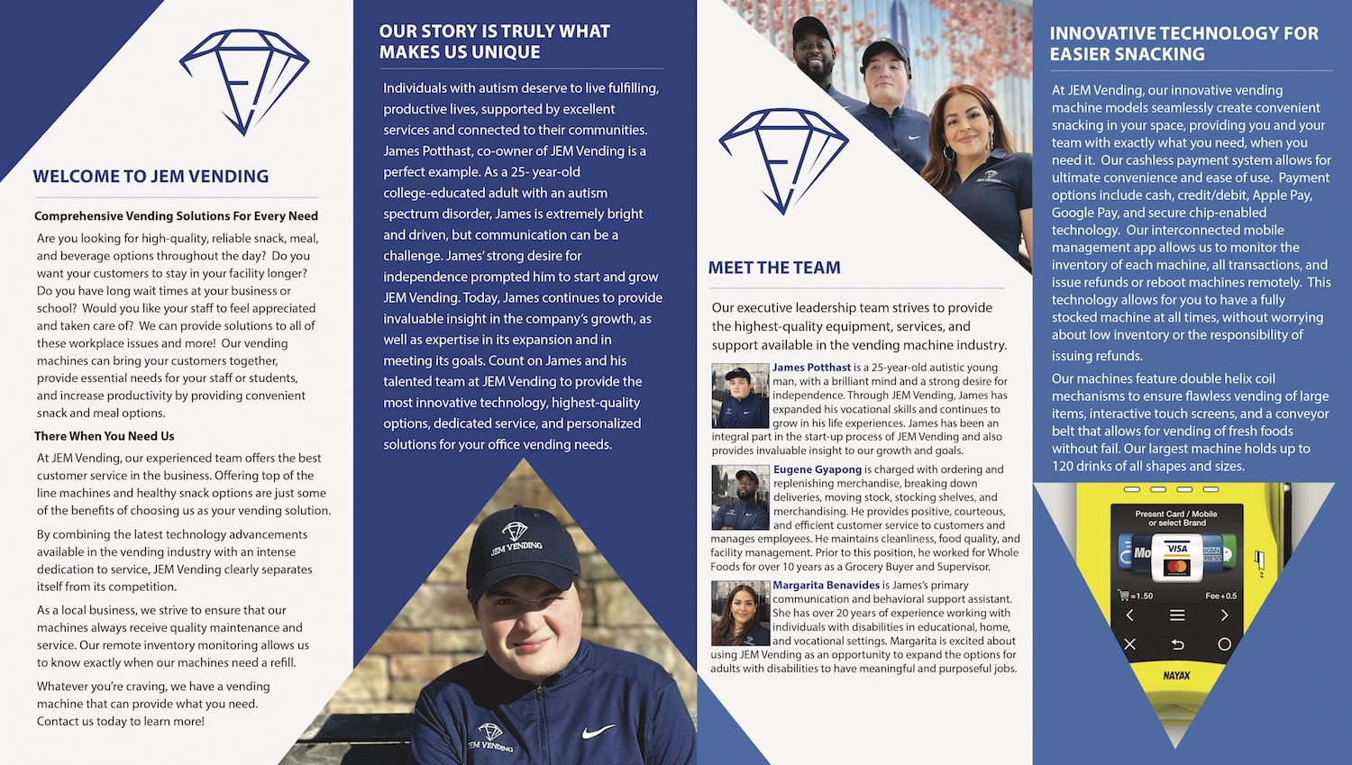 River City Marketing is thrilled to announce our completion of a brochure and logo design for JEM Vending, a vending machine supplier located in Northern Virginia with an inspirational story. Co-founded by James Potthast, a 25-year-old autistic man and Eugene Gyapong and Margarita Benavides, JEM (James, Eugene, and Margarita) Vending is committed to providing the best quality products for their customers. Their exceptional vending machines are equipped with healthy and filling snacks, candy, and drinks.